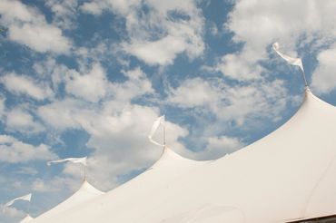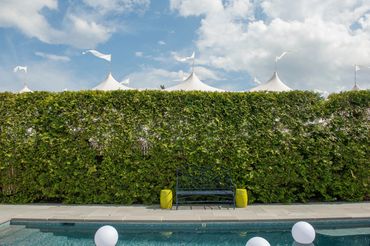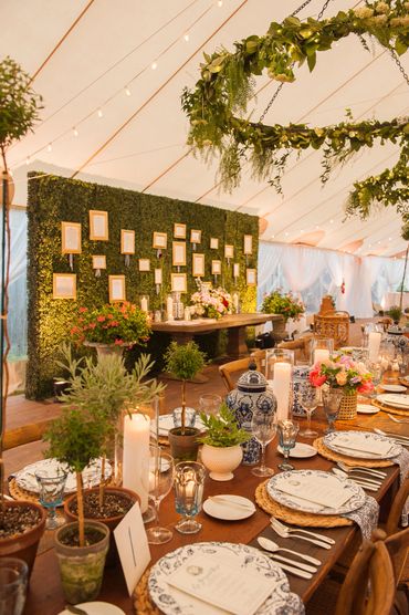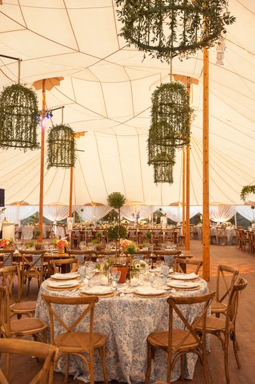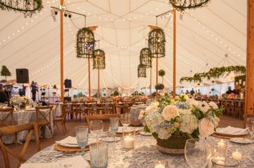 Private home, Spring Lake NJ After the happy discovery that a generous neighbor would lend her adjacent vacant property for this tented affair the client hired Katydid to plan the entire event for 280 guests. Cocktail hour was under a charming clear tent in the client’s yard, with high tops poolside. Hedge trees were temporarily removed and white arbors built to create two entrances to the vacant lot which would soon be covered by a floor and peaked (66x126) tent. Katydid made the introduction to the top restaurateur in NJ and because of their strong relationship he was willing to cater this event, closing his restaurant for the night and bringing 65 employees. Specific planning responsibilities included appropriate tent (2) clear and peaked coordination, rental of unique furniture and details for the tent such as 2 12’ curved bars and shelved backbars, farm tables, specialty chargers, plates and mismatched light blue water goblets, 10 ft high topiaries, design of overhead installation, stage, pool orbs, satellite bars, creation of a cook site for caterer, provision of 2 day of assistants, connection to graphic artist, design of overhead functional and decorative lighting and 5’ high hanging topiaries, introduction to NY photographer. Note, this event was rescheduled 4 times due to covid. As the full planner Katydid had to reschedule 11 vendors for each new date.